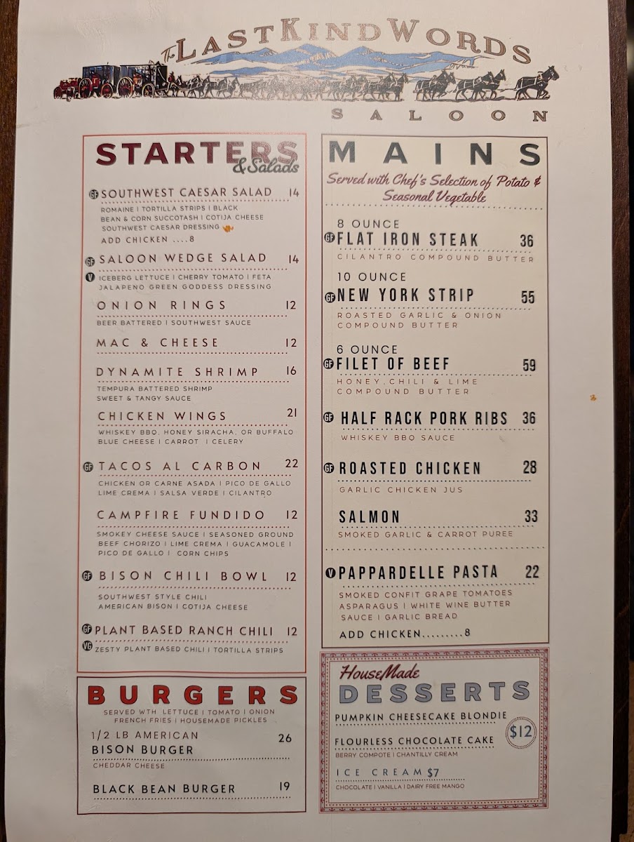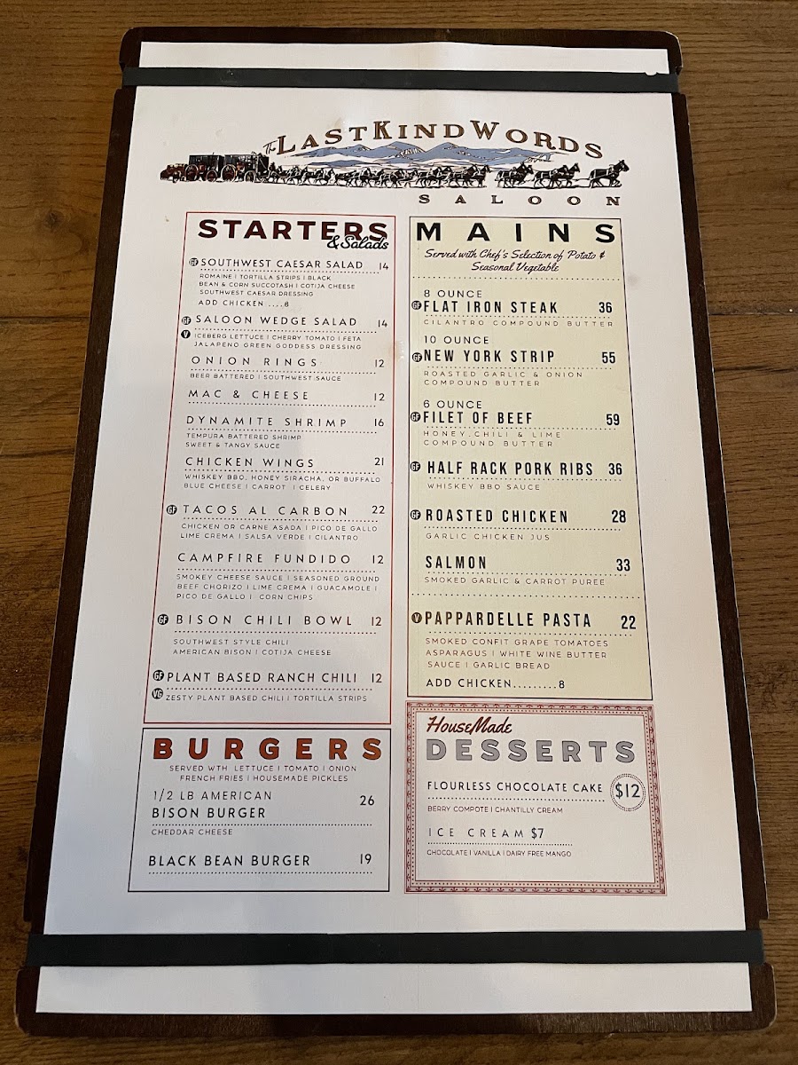 The atmosphere at Last Kind Words is a delightful mix of rustic decor and inviting vibes. As you step inside, you’re greeted by vintage-style furnishings and a cozy ambiance that transports you to a true saloon experience. The outdoor seating area is particularly charming, offering the perfect spot to soak in the unique surroundings while indulging in a meal. With friendly staff eager to make your visit memorable—shoutout to bartender Josh for exceptional service—you’ll feel right at home whether you’re a weary traveler or a local patron.